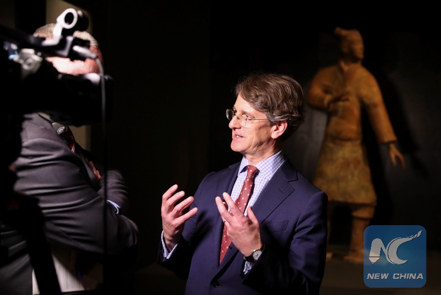 Thomas P. Campbell, Director of The Metropolitan Museum of Art, talks to media during a media preview of the Exhibition of Civilization of the Qin and Han Dynasties (221 B.C.-220 A.D.) in The Metropolitan Museum of Art, New York, the United States, on March 27, 2017. (Xinhua/Wang Ying)