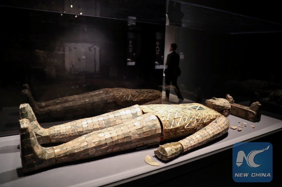 Photo taken on March 27, 2017 shows Burial Ensemble of Dou Wan, including jade with gold wire, pillow of gilt bronze and jade, and jade orifice plugs during a media preview of the Exhibition of Civilization of the Qin and Han Dynasties (221 B.C.-220 A.D.) in The Metropolitan Museum of Art, New York, the United States.(Xinhua/Wang Ying)