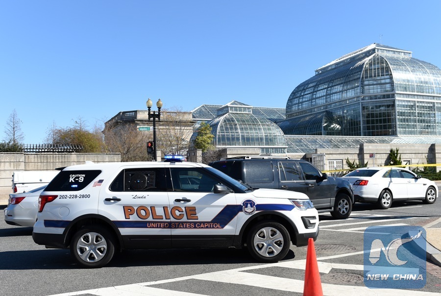 The U.S. Capitol Hill and nearby U.S. Botanic Garden are on lockdown following an incident in Washington D.C., the United States, March 29, 2017.(Xinhua/Bao Dandan)