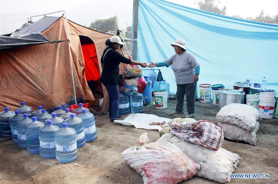 A woman receives food at a temporary shelter in Carapongo, Lurigancho-Chosica, in the province of Lima, Peru, on March 31, 2017. Peru's losses due to the coastal El Nino weather phenomenon have been estimated at 17.3 billion soles (5.3 billion U.S. dollars), according to numbers from the Maximixe consultancy published Thursday by the El Comercio daily. (Xinhua/Luis Camacho)