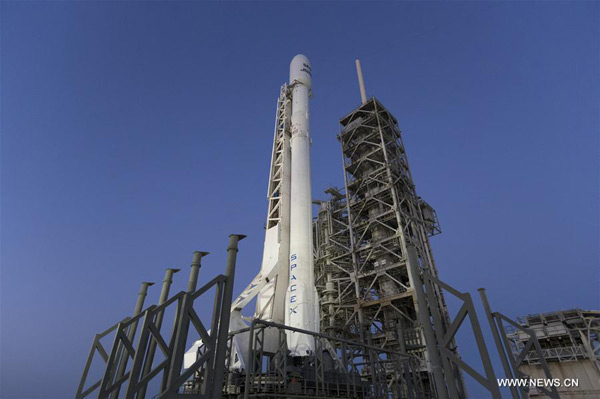 The photo made available by U.S. space firm SpaceX on March 30, 2017 shows the company's Falcon 9 rocket at the Kennedy Space Center in Florida, the United States. (Xinhua)