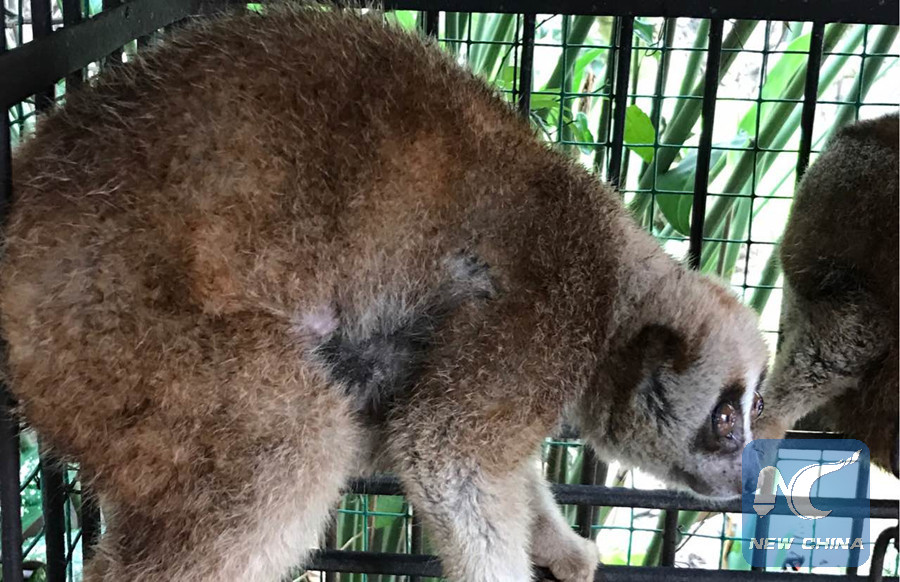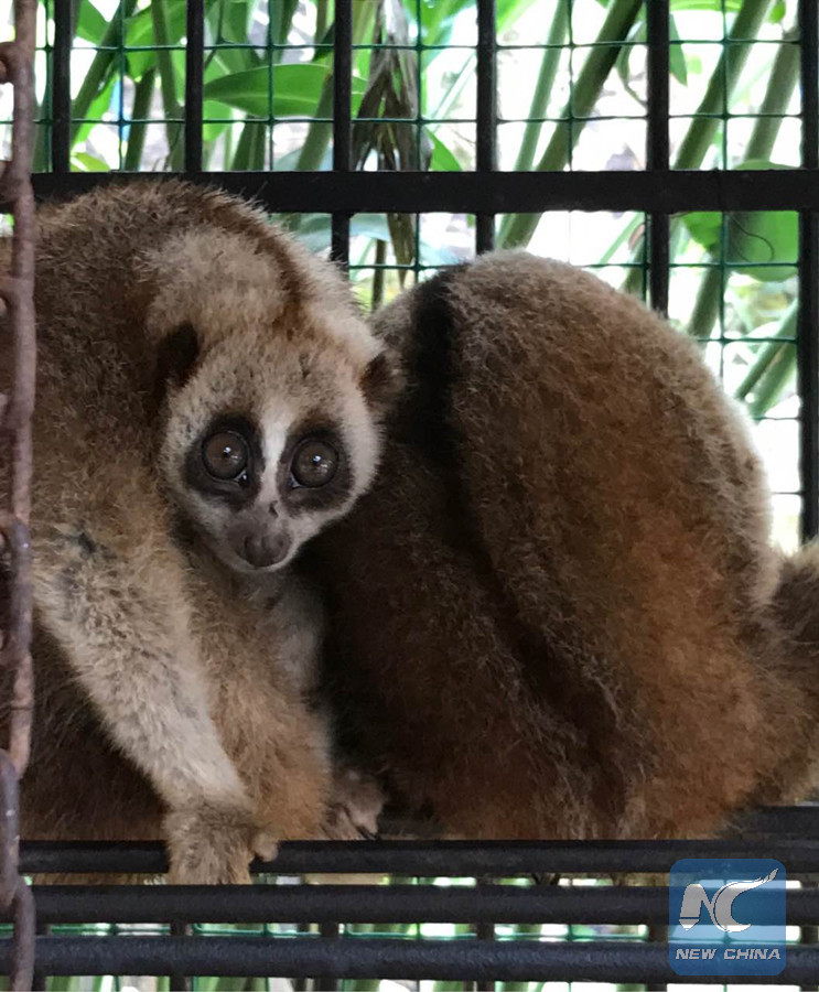 Ai En, a farmer of Mansan Village in Damenglong Township of Xishuangbanna Prefecture in southwest China's Yunnan Province, found the two lorises, a species under state protection, on February 25 in a bag believed to have been deserted by Myanmar people.