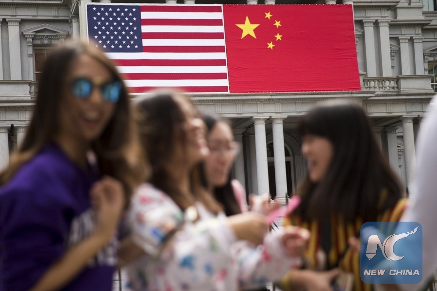 File photo taken on Sept. 24, 2015 shows China's flag is displayed next to the American flag on the side of the Old Executive Office Building on the White House complex in Washington. (Xinhua/AP)