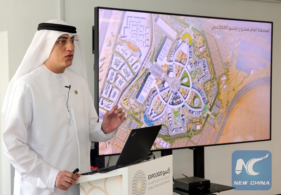 Ahmed Al Khatib, Vice President of Real Estate for Expo 2020 Dubai, speaks during a news conference as he unveils Al Wasl Plaza at the centre of Expo 2020, in Dubai, United Arab Emirates, April 3, 2017. (Xinhua/Reuters Photo)