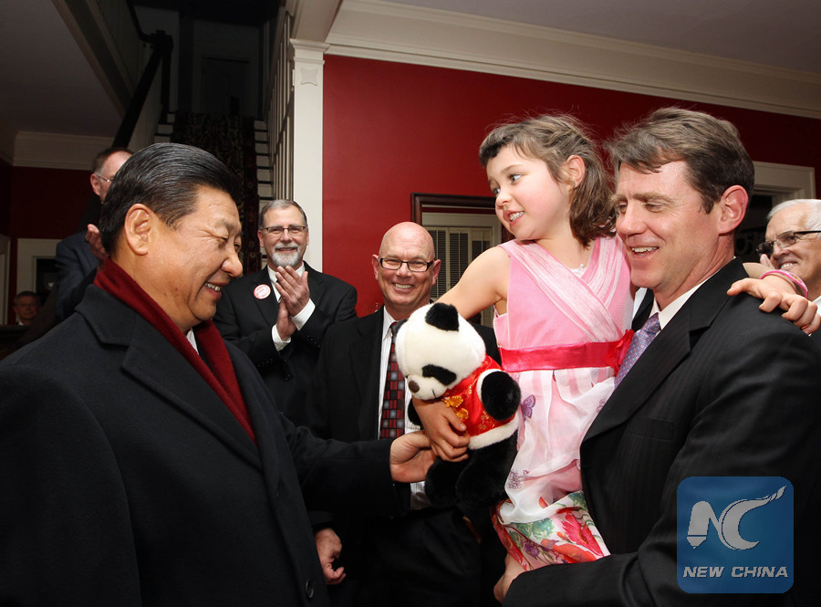 Photo taken on Feb. 15, 2012 shows Xi Jinping (L), then Chinese Vice President, presents the granddaughter of his old friend Sarah Lande with a panda doll in Muscatine, Iowa, the United States. (Xinhua/Lan Hongguang)