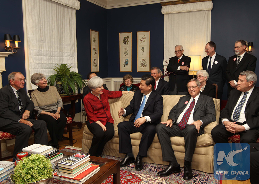 Photo taken on Feb. 15, 2012 shows Xi Jinping (3rd R, front), then Chinese Vice President, joined dozens of Americans for tea at a local house owned by his old friend Sarah Lande (3rd, L) in Muscatine, Iowa, the United States. (Xinhua/Lan Hongguang)