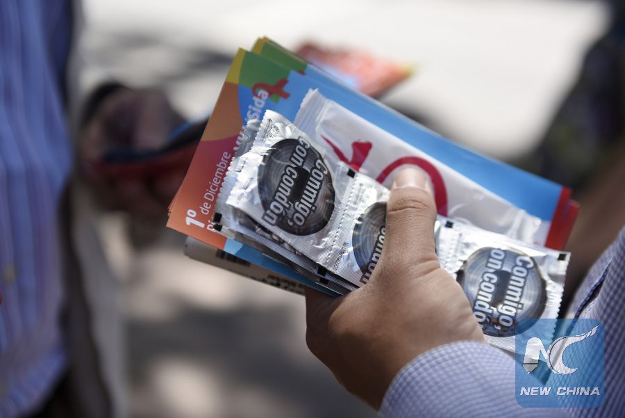 File photo shows a person hands out condoms at a university in Montevideo, capital of Uruguay, on Nov. 30, 2016. (Xinhua/Nicolas Celaya)