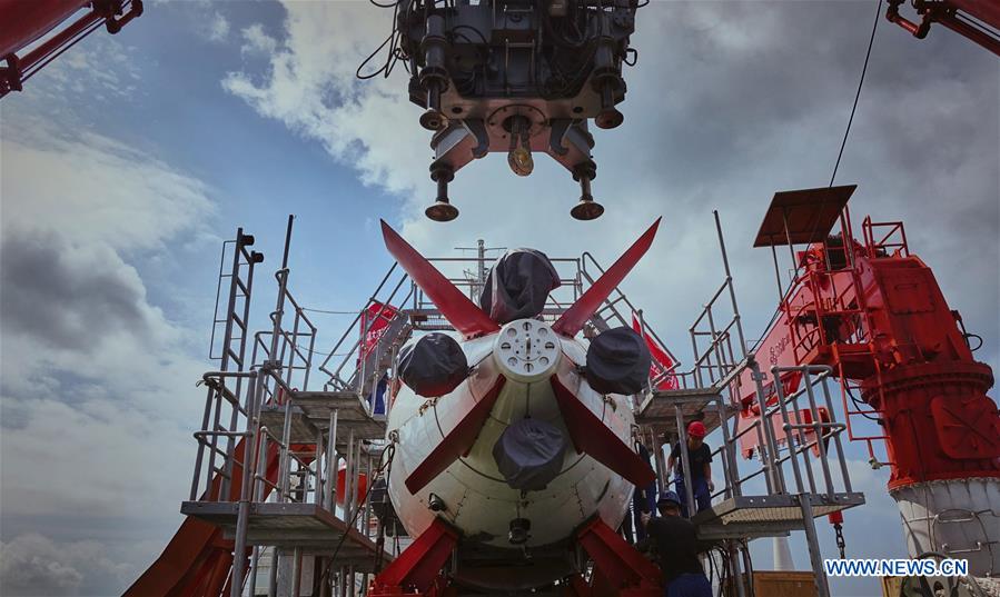 Crew members check China's manned deep-sea submersible Jiaolong in Sanya, south China's Hainan Province, April 8, 2017. The crew of China's 38th ocean scientific expedition returned to Sanya, Hainan Province, south China, Wednesday. The 59-day trip marks the conclusion of the first stage of a 124-day mission. (Xinhua/Zhao Yingquan)