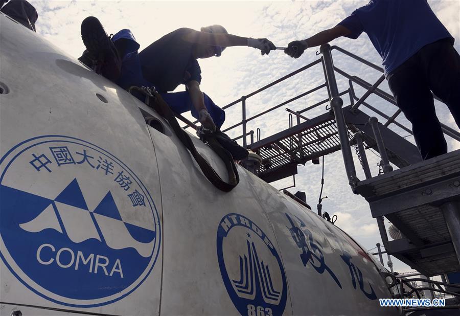Crew members check China's manned deep-sea submersible Jiaolong in Sanya, south China's Hainan Province, April 8, 2017. The crew of China's 38th ocean scientific expedition returned to Sanya, Hainan Province, south China, Wednesday. The 59-day trip marks the conclusion of the first stage of a 124-day mission. (Xinhua/Zhao Yingquan)