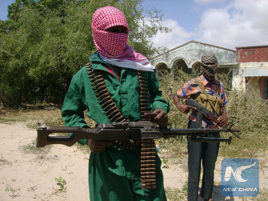 File photo shows insurgents stand guard as the extremist movement of Al-Shabaab launches a mine-sweeping operation in areas vacated by Ethiopian troops in the Somali capital of Mogadishu on Jan. 19. 2009. (Xinhua/Abdurrahman Warsameh)