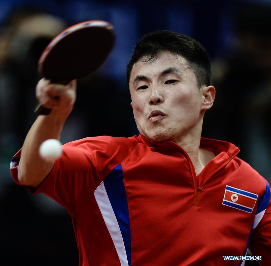 Kang Wi Hun of the Democratic People's Republic of Korea (DPRK) returns a shot in the singles match against China's Zhang Jike during the men's team quarterfinal at the 2017 ITTF-Asian Championships in Wuxi, east China's Jiangsu Province, April 10, 2017. China won by 3-0 to advance to the semifinal.(Xinhua/Li Xiang)