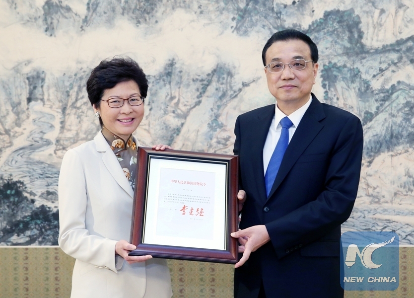 Chinese Premier Li Keqiang (R) grants the official certificate of appointment to Lam Cheng Yuet-ngor as the fifth-term chief executive of Hong Kong Special Administrative Region in Beijing, capital of China, April 11, 2017. (Xinhua/Yao Dawei)