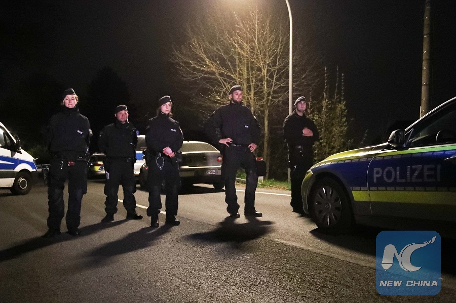 Police officers stand guard near the site where German soccer team Dortmund's bus was damaged by explosions in Dormund, Germany, on April 11, 2017. (Xinhua/Ulrich Hufnagel)