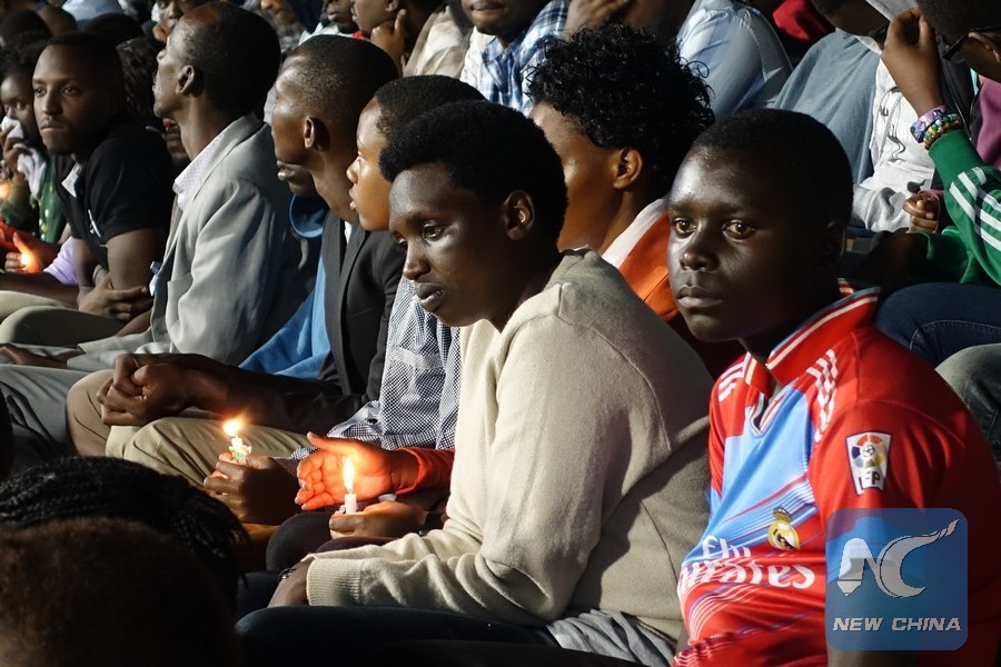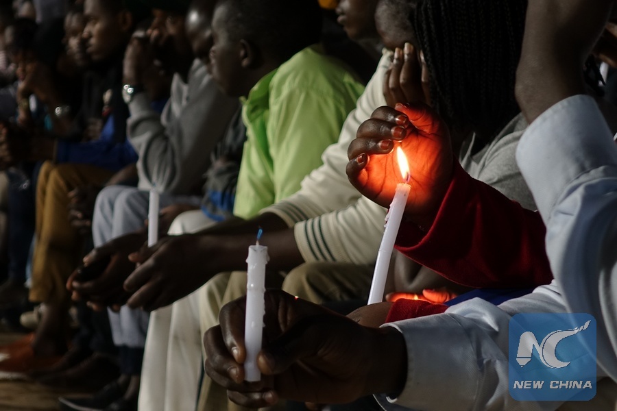 People hold candles during a night vigil commemorating the 1994 genocide against the Tutsi in Rwanda at Amahoro National Stadium in Kigali, Rwanda, on April 7, 2017. Lighting the flame of hope and laying the wreath at the Kigali Genocide Memorial Centre marked the start of the 23rd commemoration of the 1994 genocide in which more than one million people in Rwanda, mainly Tutsi and moderate Hutus, were killed. (Xinhua)