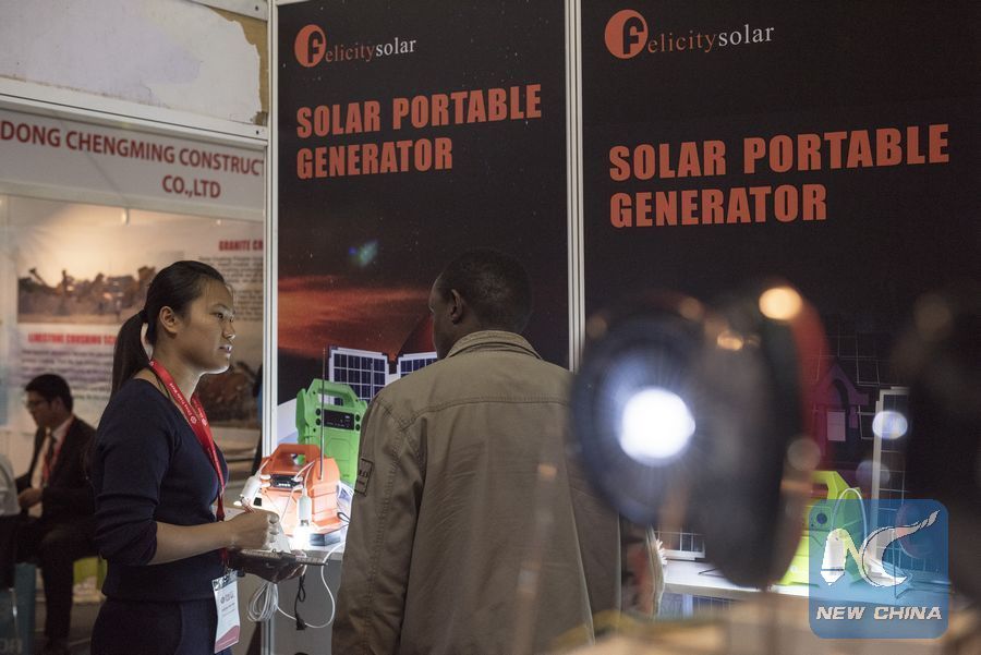 File photo shows an exhibitor (L) introducing the portable solar generators to a visitor during the China Trade Week in Nairobi, Kenya, June 29, 2016. (Xinhua/Sun Ruibo)