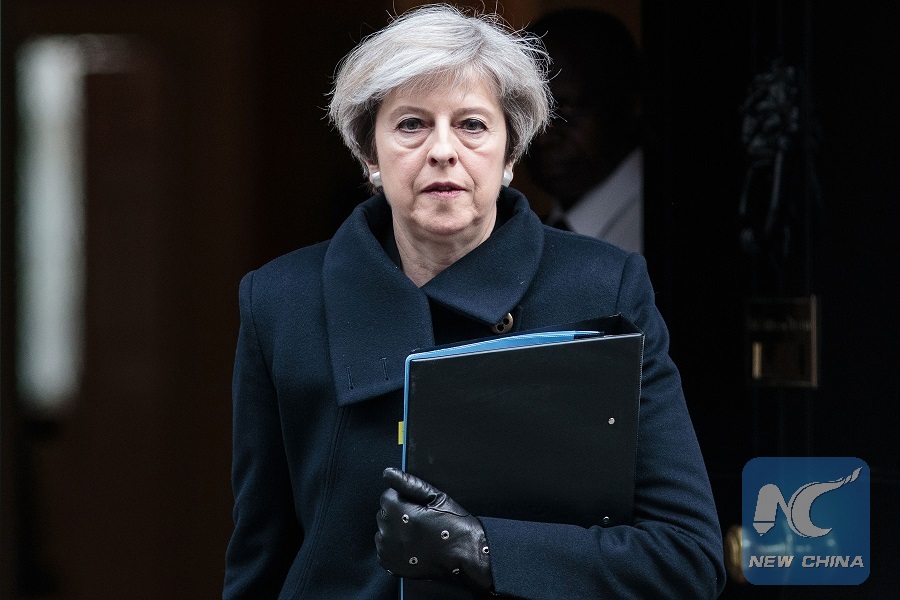 British Prime Minister Theresa May leaves 10 Downing Street in London, Britain on March 23, 2017. (Xinhua/Pool/Getty Images)