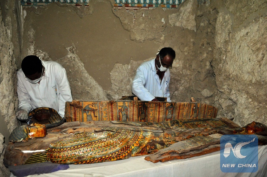 Egyptian archaeologists have discovered six mummies, colourful wooden coffins and more than 1,000 funerary statues in the 3,500-year-oldtomb, the antiquities ministry said on April 18. (Xinhua/AFP Photo)