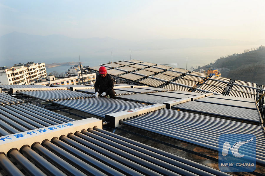 File photo shows a worker checks solar energy collecting tubes on the roof of a local hotel in Zigui County, China's Hubei Province, Dec. 24, 2008. (Xinhua/Zheng Jiayu)