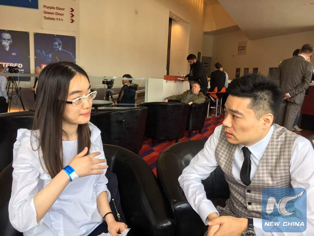 Ding Junhui talks to Xinhua intern reporter Ru Ge at the Crucible Theatre in Sheffield. (Xinhua/Wang Zijiang)