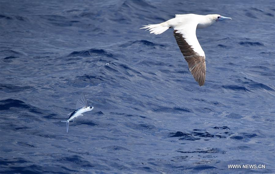 A flying fish jumps out of water behind a red-footed booby in Sansha, south China's Hainan Province, April 24, 2017. A kind of magic fish or flying fish, which has swings and is able to glide over sea, can be seen in waters of Xisha Islands. (Xinhua/Guo Cheng)