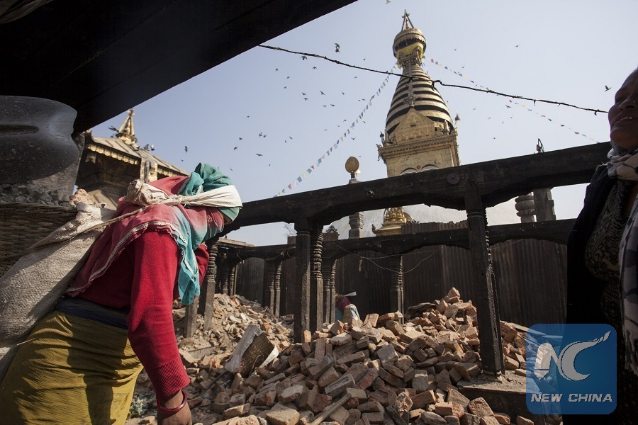 A Nepalese laborer works amidst the debris at a Tamang monastery damaged during the 2015earthquake, at Swayambhunath in Kathmandu, Nepal, Jan. 24, 2017. (Xinhua/Pratap Thapa)