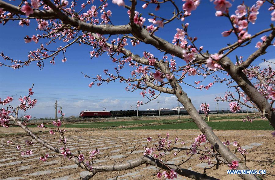 A train runs past peach flowers at Caohu Village of Zhangye City, northwest China's Gansu Province, April 25, 2017. (Xinhua/Chen Li)