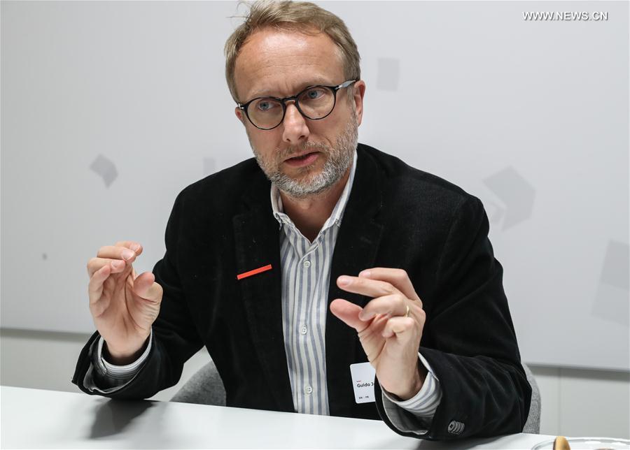 ABB Group's chief digital officer Guido Jouret speaks during an interview with Xinhua News Agency at the Hanover Messe 2017 in Hanover, Germany, on April 24, 2017. The combination of better cameras, better sensors and machine learning will lead to more extensive application of robots in production, said ABB Group's chief digital officer Guido Jouret in an interview with Xinhua at the Hanover Fair. (Xinhua/Shan Yuqi)