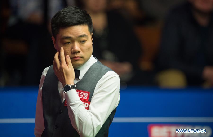 Ding Junhui of China reacts during the first session of the semifinal against Mark Selby of England during the World Snooker Championship 2017 at the Crucible Theatre in Sheffield, Britain on April 27, 2017. (Xinhua/Jon Buckle)