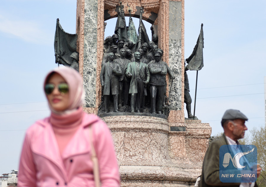 Tourists visit Istanbul's Taksim Square, Turkey, on April 17, 2017. Turkish President Recep Tayyip Erdogan has declared victory in a constitutional reform referendum that will give him sweeping powers, amid an outcry from the opposition that the voting was rigged. (Xinhua Photo)