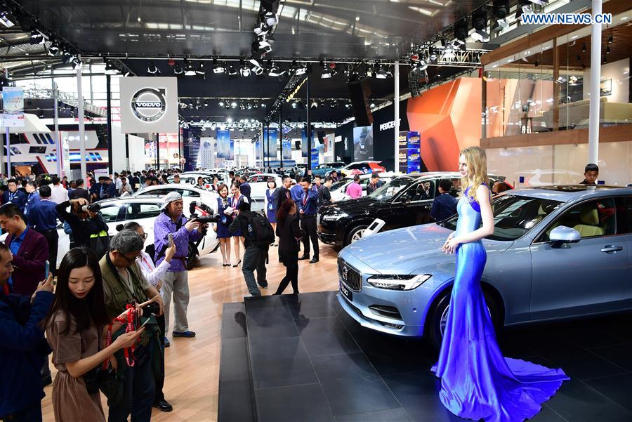 Visitors look at a Volvo sedan at an auto show in Xi'an, capital of northwest China's Shaanxi Province, April 28, 2017. (Xinhua/Shao Rui)