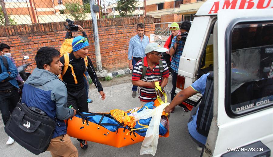 The body of famous Swiss climber Ueli Steck known as "Swiss Machine" is carried towards hospital after transported from a helicopter at Teaching Hospital in Kathmandu, Nepal on April 30, 2017. Famous Swiss climber Ueli Steck, popularly known as "Swiss Machine," died on Sunday as he fell to the foot of Mount Nuptse, Nepalese officials and expedition organizing company said. (Xinhua/Sunil Sharma)