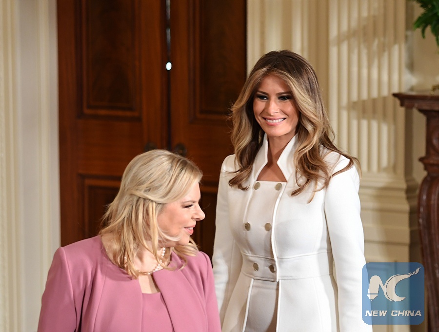 U.S. first lady Melania Trump (R) and Sara Netanyahu, visiting Israeli Prime Minister Benjamin Netanyahu's wife, arrive for a joint press conference between U.S. President Donald Trump and visiting Israeli Prime Minister Benjamin Netanyahu at the White House in Washington D.C., the United States, on Feb. 15, 2017. (Xinhua File Photo/Yin Bogu)