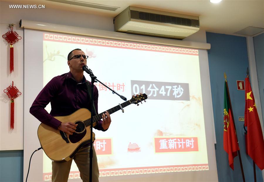 Contestant Jose Pinto takes part in the preliminary competition of the "Chinese Bridge" --Chinese Proficiency Competition for Foreign Students (Portugal Division) in Leiria, Portugal, on April 29, 2017. A total of 7 contestants took part in the competition. (Xinhua/Zhang Liyun)