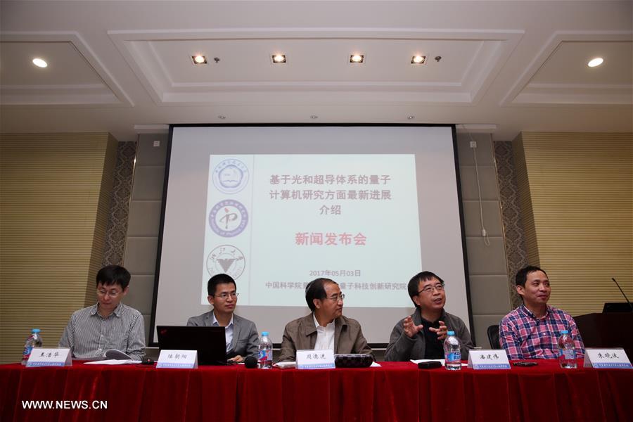 Chinese leading quantum physicist Pan Jianwei (2nd R), an academician of the Chinese Academy of Sciences and his colleagues announce their achievements at a press conference in Shanghai, east China, May 3, 2017. Chinese scientists have built world's first quantum computing machine that goes beyond the early classical -- or conventional -- computers, paving the way to the ultimate realization of quantum computing beating classical computers. (Xinhua/Jin Liwang)