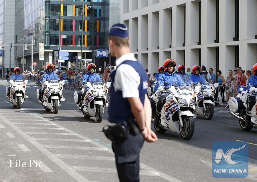 Belgian Police pass by during the Military Parade to celebrate Belgium's National Day in Brussels, Belgium, July 21, 2016. (Xinhua/Ye Pingfan)