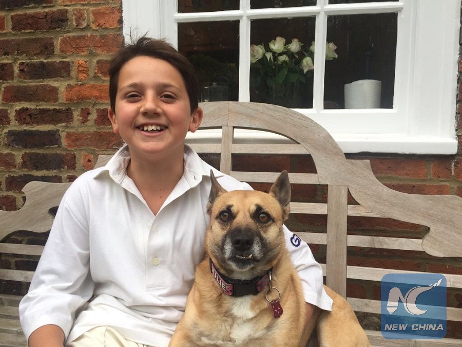 Photo provided to Xinhua by Didier's father, Olivier Levenfiche, shows Didier is posing for a photo with his pet dog.