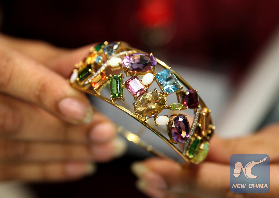 A gemstone jewelry is shown at the 2nd Arusha International Gem, Jewelry and Minerals Fair in Arusha, Tanzania, Oct. 28, 2013. (Xinhua/Zhang Ping)