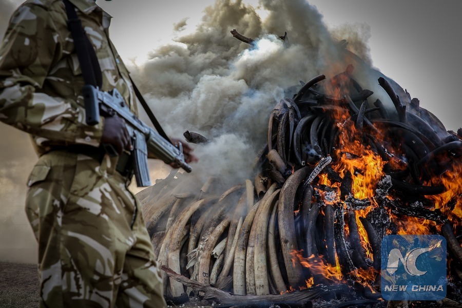 A Kenyan armed ranger stands guard at the site of burning contraband ivory in Nairobi, Kenya, on March 3, 2015. (Xinhua/Pan Siwei)
