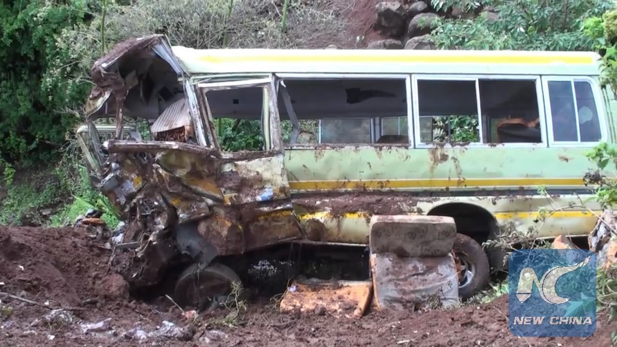Photo shows scene of a school bus accident on Saturday morning that killed at least 32 people, including 29 pupils in northern Tanzania's Karatu District. (Xinhua)