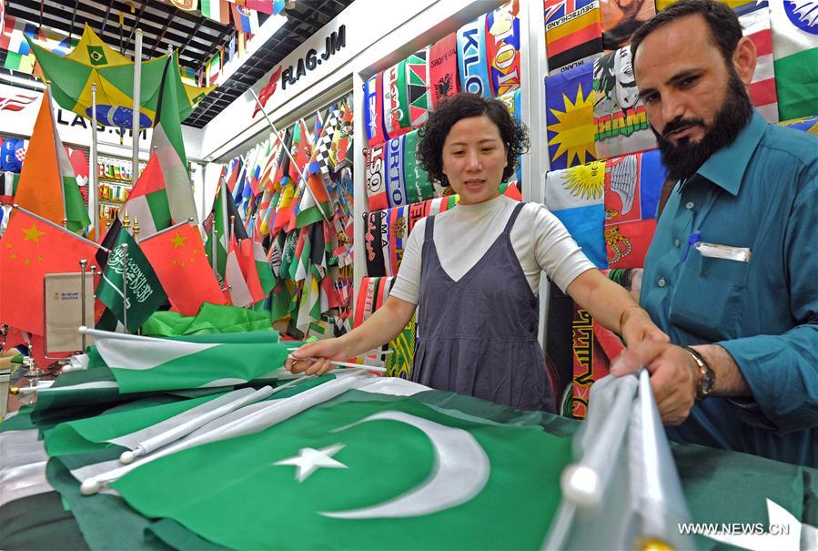 Businesswoman Wei Meizhen (L) shows the Pakistani national flags to a Pakistani merchant in Yiwu City, east China's Zhejiang Province, May 6, 2017. Yiwu City, as the world's largest small commodity market and transfer hub, saw the total import and export value of 48.88 billion yuan (7.08 billion U.S. dollars) in the first quarter of 2017, growing 23.72 percent year on year. Over 1.8 million kinds of commodities have been exported from Yiwu to 219 countries and regions in the world. (Xinhua/Tan Jin)