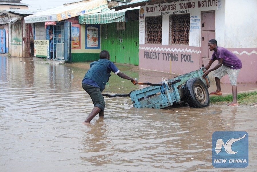 File photo shows residents of Mombasa wade through a flooded road in Mombasa, Kenya, June 19, 2016.(Xinhua/Allan Mutiso)