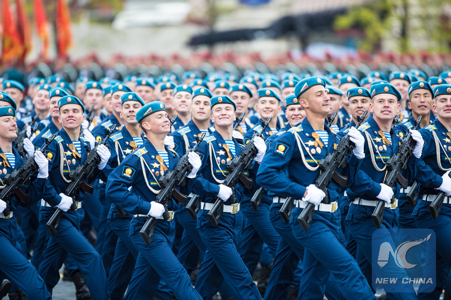 About 10,000 Russian servicemen from the ground force, the navy, the air force, the airborne troops and the Federal Security Service participated in the parade, and dozens of military vehicles and armaments were displayed in the presence of Russian President Vladimir Putin, senior officials and war veterans.