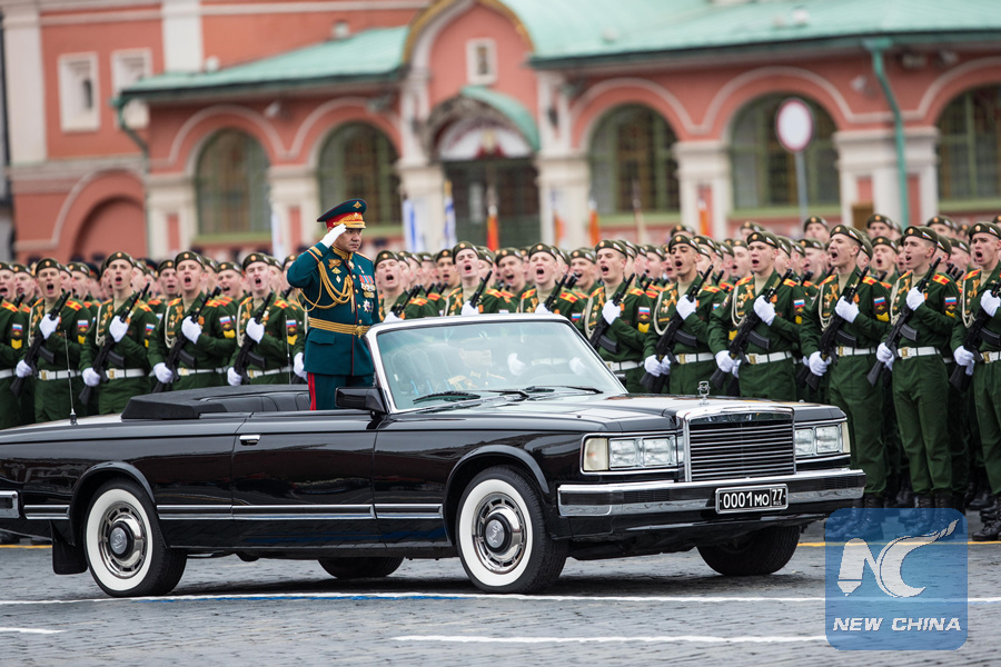 Russian Defense Minister Sergei Shoigu (Standing in the car) inspects troops during the Victory Day parade in Moscow, Russia, May 9, 2017. (Xinhua/Wu Zhuang)