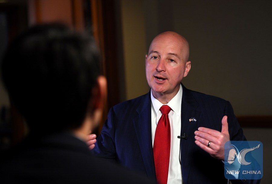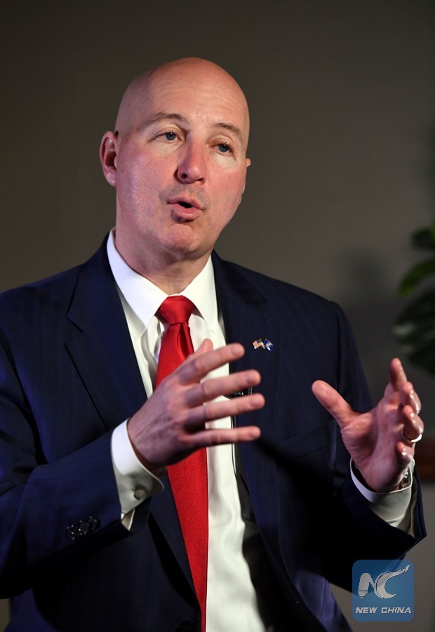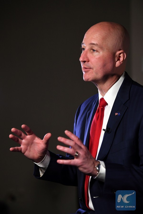 U.S. Nebraska Governor Pete Ricketts speaks in an exclusive interview with Xinhua News Agency in Omaha, Nebraska, the United States, on May 5, 2017.(Xinhua/Yin Bogu)