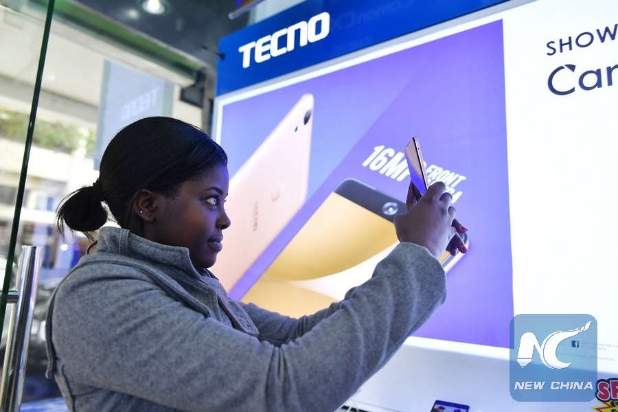 A customer takes selfies with Tecno mobile phone in downtown Nairobi, capital of Kenya, on May 9, 2017. Chinese mobile phone manufacturer Tecno Mobile sales reached 25 million devices, including 9 million smartphones in 2015, helping it to sustain the most "popular" brand status in Africa. (Xinhua/Sun Ruibo)