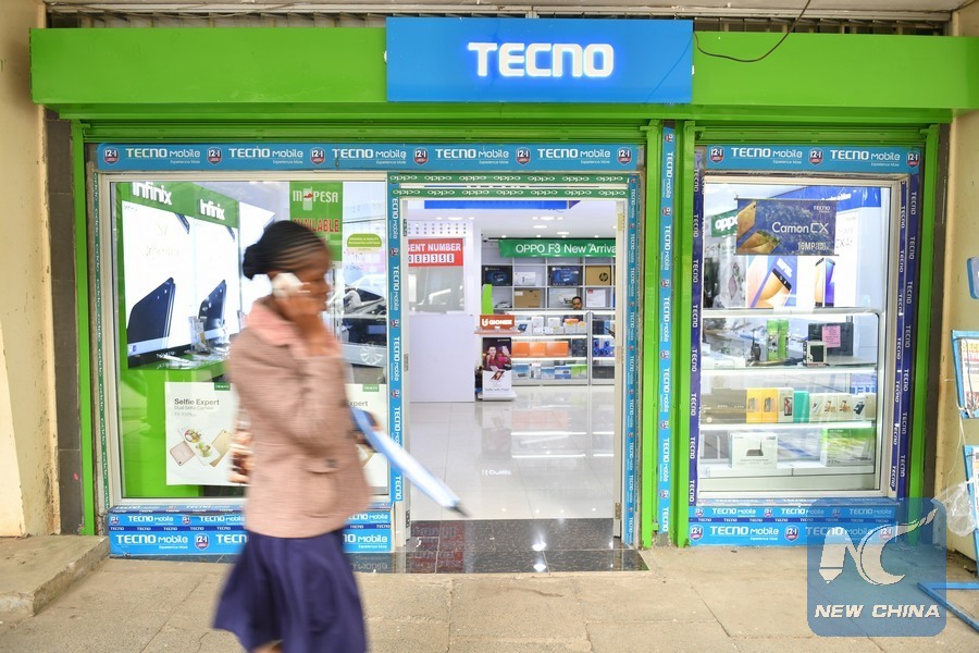 A pedestrian walks past a mobile phone shop in downtown Nairobi, capital of Kenya, May 9, 2017. Chinese mobile phone manufacturer Tecno Mobile sales reached 25 million devices, including 9 million smartphones in 2015, helping it to sustain the most "popular" brand status in Africa. (Xinhua/Sun Ruibo)