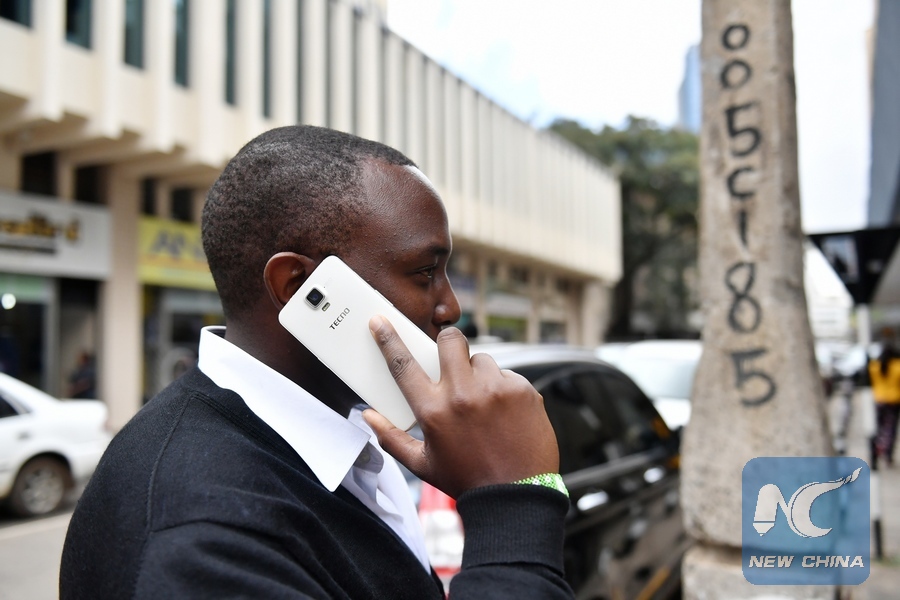 A man uses Tecno mobile phone in downtown Nairobi, capital of Kenya, May 9, 2017. Chinese mobile phone manufacturer Tecno Mobile sales reached 25 million devices, including 9 million smartphones in 2015, helping it to sustain the most "popular" brand status in Africa. (Xinhua/Sun Ruibo)