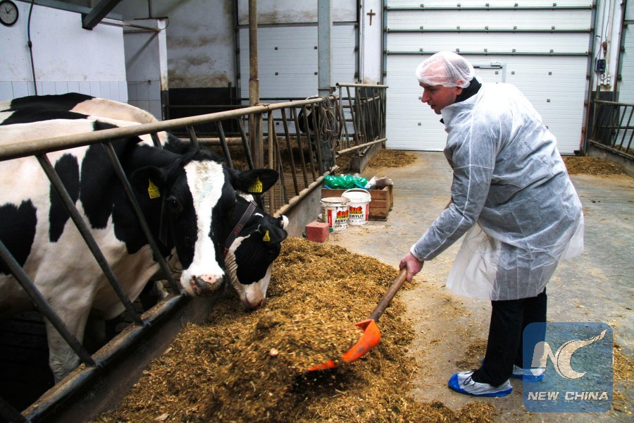 Mariusz Marczak feeds his cows in the village of Lipnice, near the Polish capital of Warsaw, on April 19, 2017. (Xinhua/Chen Xu)