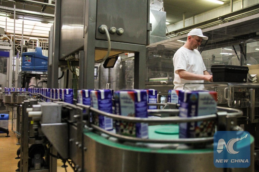 An employee works at a dairy factory in the village of Lipnice, near the Polish capital of Warsaw, on April 19, 2017. (Xinhua/Chen Xu)