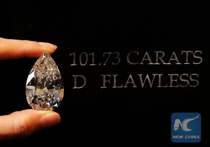 A worker shows the 101.73-carat diamond to the media at the Christie in Geneva, Switzerland, April 30, 2013. (Xinhua/Wang Siwei)